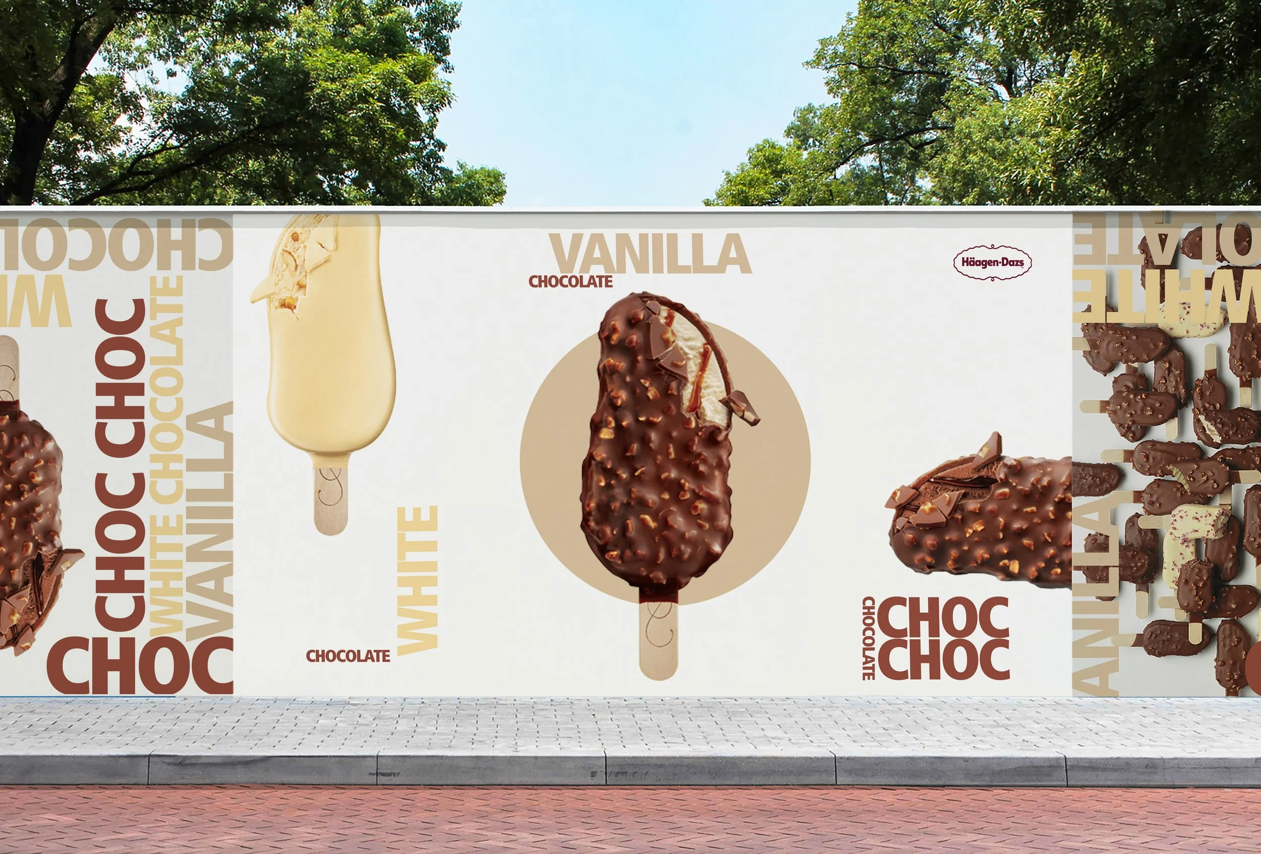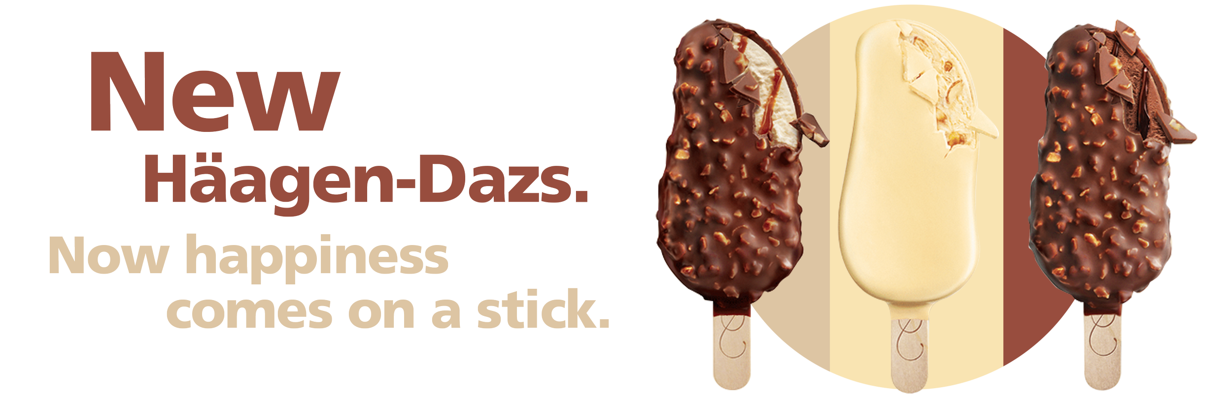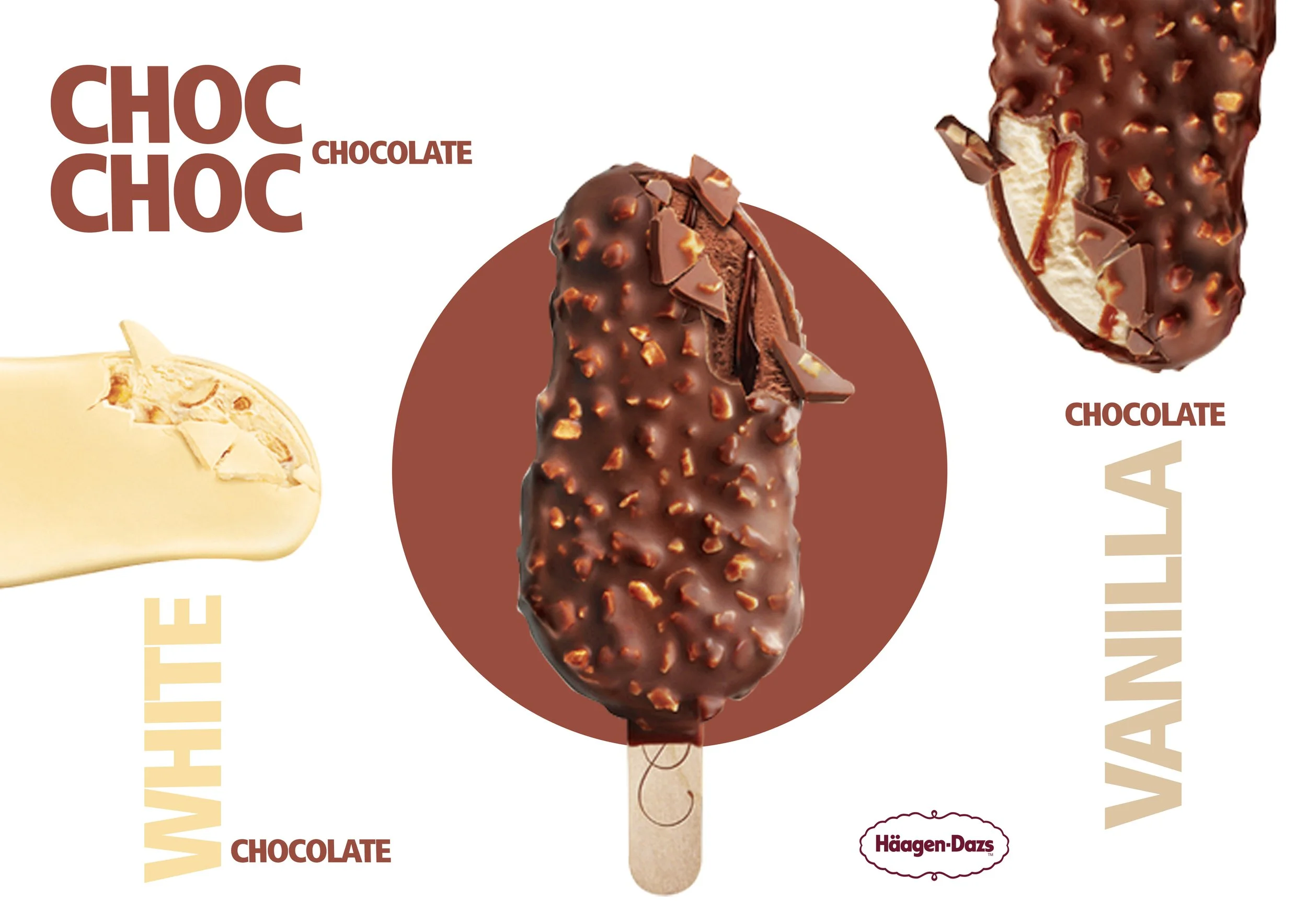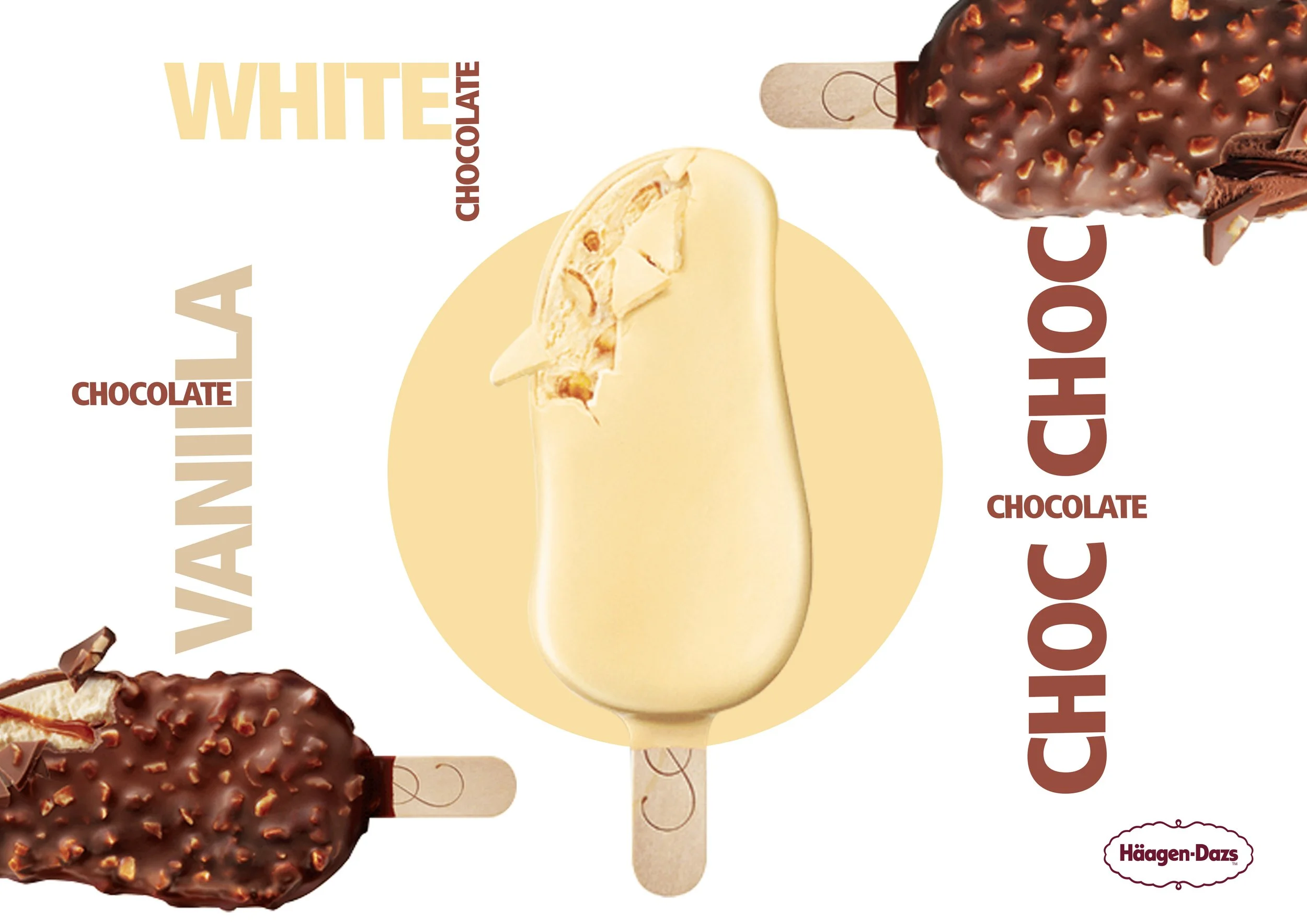 New product launching campaign for the three new flavours of Häagen-Dazs ice cream stick bars: White Chocolate Almond, Vanilla Chocolate Almond and Choc Choc Almond.