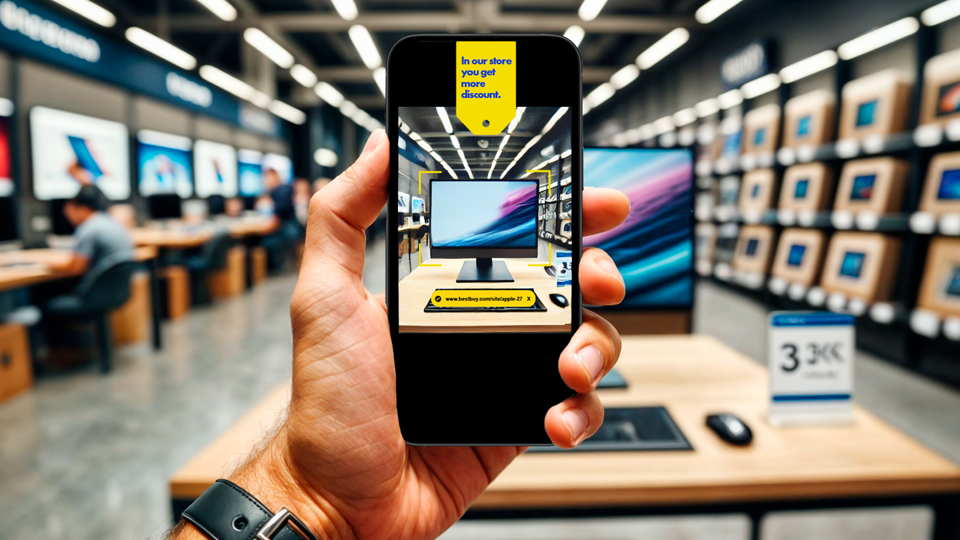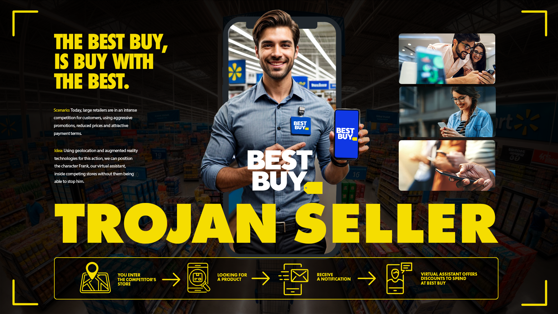 Using geolocation and augmented reality technologies for this action, we can place our virtual assistant character Frank inside competitor stores without being able to stop him. He will interact with customers, assisting them in choosing the best products and offering special deals to encourage them to shop at Best Buy's online store.